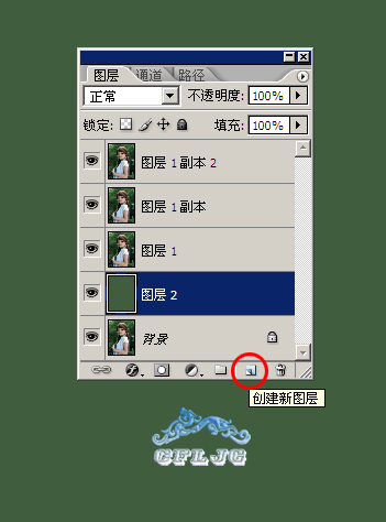 01、打開圖片,ctrl+j3次,分別得到圖層1、圖層1副本和圖層1副本2,點擊紅圈處新建圖層2,放于圖層1和背景層之間。