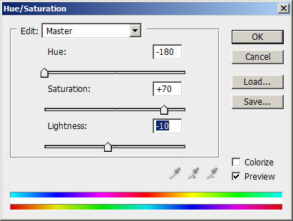 2.再?gòu)?fù)制一個(gè)原始圖片,放到頂層,打開(kāi)色相飽和度選項(xiàng)(編輯---調(diào)整---色相飽和度),設(shè)置如下:
