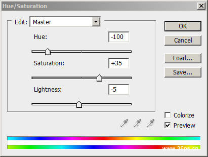 4.新建一個(gè)色相飽和度圖層,新建方法是點(diǎn)擊圖層菜單---點(diǎn)擊新調(diào)整圖層----色相飽和度,點(diǎn)擊確定后你會(huì)發(fā)現(xiàn)圖層面板多了一個(gè)新圖層,并彈出一個(gè)設(shè)置窗口,按照以下參數(shù)設(shè)置。