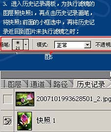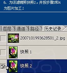 3、進入歷史記錄調板,為執行濾鏡的圖層快照1,再點擊歷史記錄畫筆,將快照1前面的小框選中,再將歷史記錄返回到圖片未執行濾鏡之時。