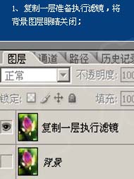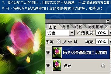 7、加工后,因感覺效果不夠滿意,于是將隱藏的背景圖層打開,將用歷史記錄畫筆加工后的圖層模式改為“濾色”。