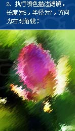 2、執行:濾鏡 > 畫筆描邊 > 噴色描邊,長度為5,半徑為7,方向為右對角線。