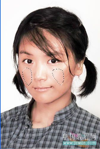 7、在臉蛋上作出如圖選區(qū),羽化8~10,新建一層,填充252,160,160數(shù)值的淡紅,取消選區(qū)后將不透明度改為 50%,ctrl+shift+e,合并全部圖層。