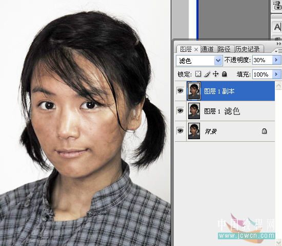 1、打開(kāi)原圖,我們發(fā)現(xiàn)這個(gè)圖片偏暗,先提高亮度:復(fù)制兩層,將圖層1和圖層1副本混合模式都改為濾色,圖層1副本的不透明度改為30%,現(xiàn)在的效果如圖。