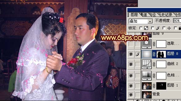 4、新建一個圖層,選擇漸變工具,顏色設置為黑白漸變,然后由中心拉出白色到黑色的徑向漸變,確定后把圖層混合模式改為“疊加”,圖層不透明度改為:80%,加上圖層蒙版用黑色畫筆把人物部分擦出來,如圖9。