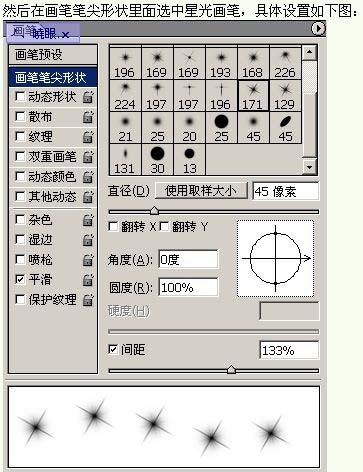 2、選擇畫筆筆尖形狀,選擇星光畫筆,參數(shù)設置如下圖。