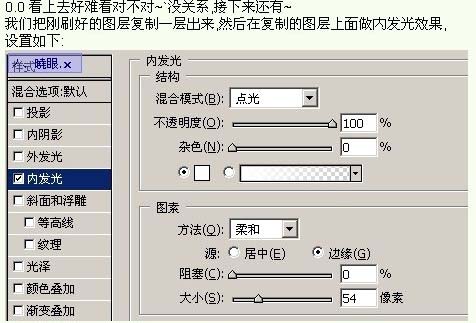 6、我們把剛刷好的圖層復制一層,然后在復制的圖層上做內(nèi)發(fā)光效果,參數(shù)設置如下圖。