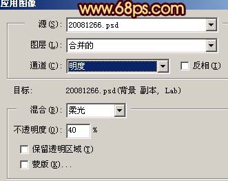 1、打開原圖素材,選擇菜單:圖像 > 模式 > lab顏色,確定后把背景圖層復制一層,執行:圖像 > 應用圖像,參數設置如圖1,效果如圖2。