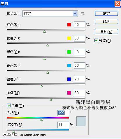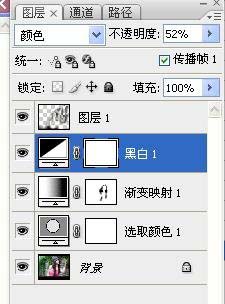 3、創(chuàng)建黑白調(diào)整圖層,參數(shù)設(shè)置如下圖,確定后把圖層混合模式改為“顏色”,圖層不透明度改為:52%。