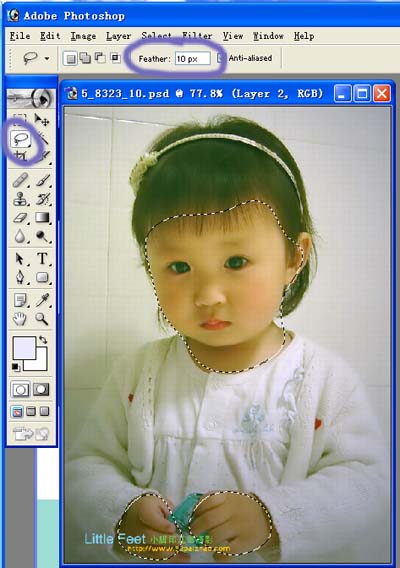 4、白平衡的調整就到此為止,接下去的工作就是把小baby的皮膚處理的更加通透,新建一層,敲一個圖章(方法是shift+ctrl+alt+e),用套索工具把小baby的皮膚選出來,feather的值我設定為10個像素,如圖 。