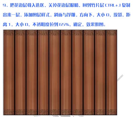 9、把花邊層載入選區(qū),關掉花邊層眼睛,回到竹片層,按ctrl + j復制出來一層,添加圖層樣式,斜面與浮雕,方向下,大小0,投影距離為1,大小0,不透明度65%,效果如下圖。