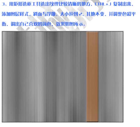 3、用矩形選框工具選出紋理比較清晰的地方,按ctrl + j復制出來,添加圖層樣式,斜面與浮雕,大小為2,其它設置不變,并調(diào)整色彩平衡,調(diào)出自己喜歡的顏色,效果如下圖。