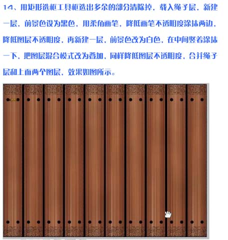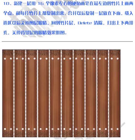10、新建一層用16個像素左右的硬畫筆在最左邊的竹片上畫兩個點,和每片竹片上都復制出來,合并以后復制一層放到下面,載入選區(qū)以后關掉圖層眼睛,回到竹片層,delete清除,打出上下兩排孔,關掉背景層的眼睛效果如圖。