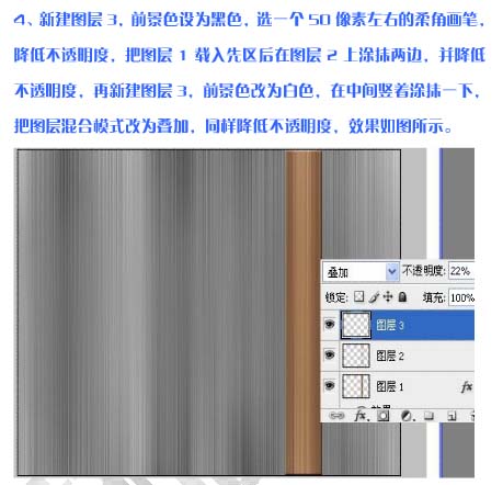 4、新建圖層3,前景色設置為黑色,選一個50像素左右的柔角畫筆,降低不透明度,把圖層1載入選區(qū)后在圖層2上涂抹兩邊,并降低不透明度,再新建圖層3,前景色改為白色,在中間豎著涂抹一些,把圖層混合模式改為“疊加”,同樣降低不透明度,效果如下圖。