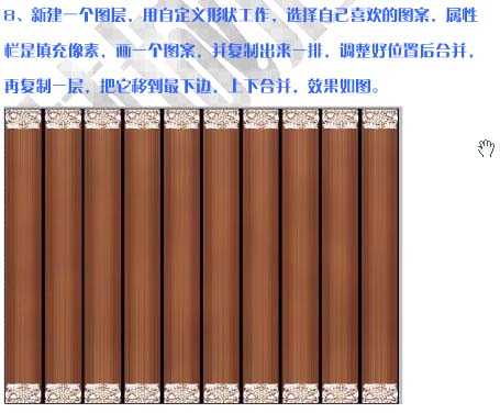 8、新建一個圖層,用自定義形狀工具,選擇自己喜歡的圖案,屬性欄是填充像素,畫一個圖案,并復制出來一排,調(diào)整好位置后合并,再復制一層,把它移到最下面,上下合并,效果如下圖。