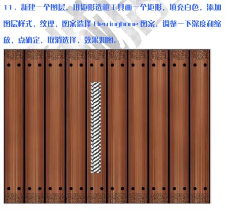 11、新建一個圖層,用矩形選框工具畫一個矩形,填充白色,添加圖層樣式,文字,圖案選擇抽絲圖案,調(diào)整一下深度和縮放,點確定,取消選擇,效果如下圖。