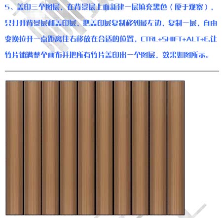 5、蓋印三個圖層,在背景層上面新建一層填充黑色,只打開背景圖層和蓋印層,把蓋印層復制移到最左邊,復制一層,自由變換拉開一點距離往右移放在合適的位置,ctrl + shift + alt + e讓竹片鋪滿整個畫布并把所有竹片蓋印出一個圖層,效果如下圖。(這一步操作主要是把上一步做好的單一竹片,復制平列排好,可以選擇自己的方法去復制,作者的可能有點復雜)。