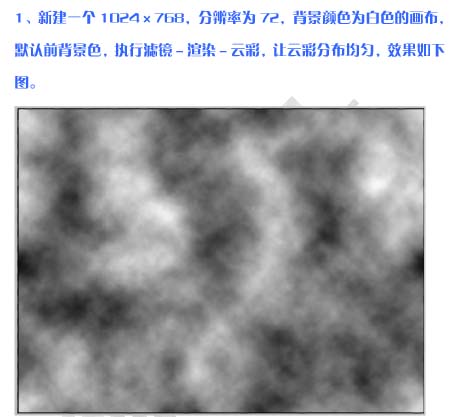 1、新建一個1024 * 768像素的文件,背景設置為白色,前景設置為黑色,然后執(zhí)行:濾鏡 > 渲染 > 云彩,讓云彩分布均勻,可以多按ctrl + f嘗試幾次,效果如下圖。