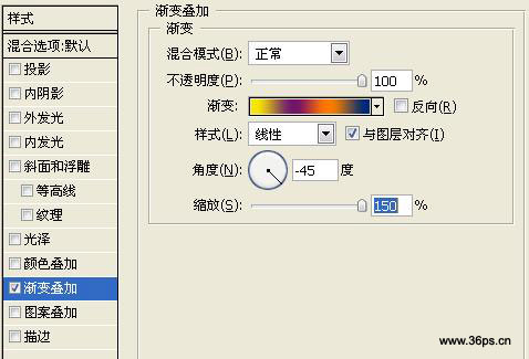第三步,右鍵點(diǎn)擊這個(gè)新圖層,點(diǎn)擊圖層樣式選項(xiàng),選擇漸變疊加,漸變顏色選擇黃色、紫色、橙色、藍(lán)色(點(diǎn)擊漸變顏色后面的選擇框,預(yù)設(shè)里面的漸變顏色里面已經(jīng)有這個(gè)顏色了,不需要自己去調(diào)了哈?。?,其他設(shè)置如下:
