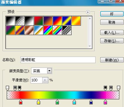 6.再新建一個(gè)圖層,選擇漸變工具,為這個(gè)圖層添加透明彩虹漸變。拉漸變線條的時(shí)候從左上到右下。