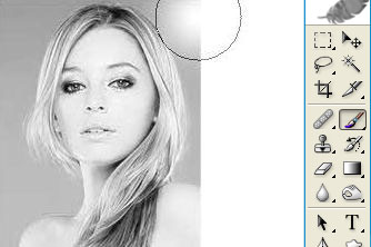 第五步,現(xiàn)在用畫筆工具給美女虛化一下周圍,選一個(gè)軟邊的畫筆,100像素白色,將美女周圍涂抹一下,涂抹成白色。