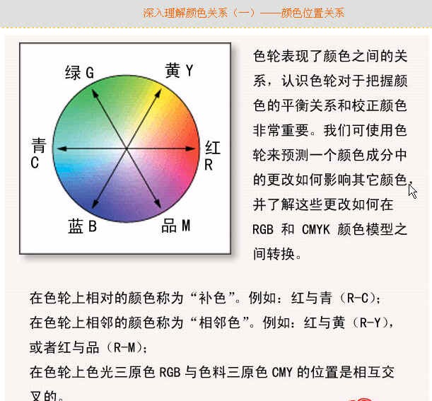 由此,我們引伸出“色輪”的概念。這個色輪共360度,從紅色開始,劃為60度一格。逆時針轉動色輪,紅與綠相隔120度,中間夾了黃色y,而且黃色的范圍要細小一些,說明黃色是由紅色與綠色混合而成的。從綠色再過去120度是藍色,中間細小的地帶是青色c。藍色與紅色中間夾的是品色m。你可以記住每種顏色的對家:紅對青,黃對藍,綠對品。我們要記住它們的排列: