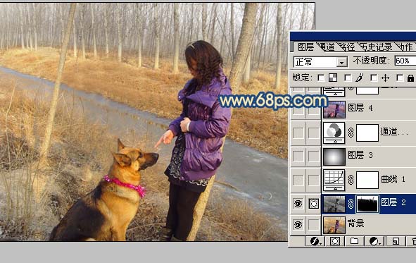 1、打開原圖素材,點通道面板,選擇藍色通道按ctrl + a全選,按ctrl + c復(fù)制,回到圖層面,新建一個圖層,按ctrl + v粘貼,把藍色通道復(fù)制過來,然后加上圖層蒙版,只保留地面以上部分,其它部分用黑色畫筆擦掉,再把圖層的不透明度改為:60%,如圖1。