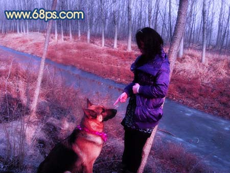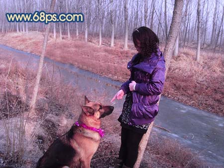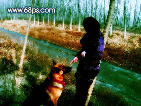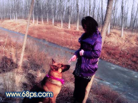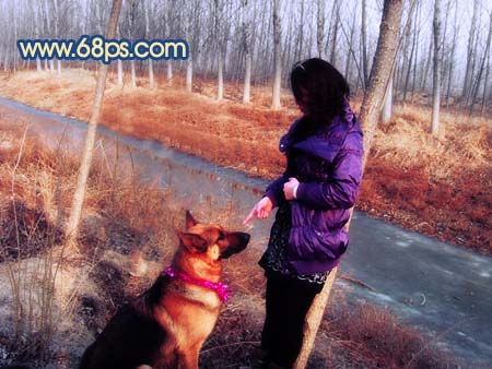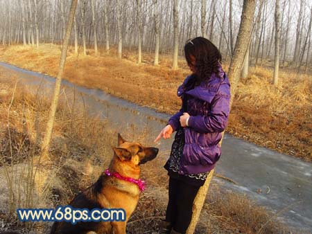 13、把背景圖層復(fù)制一層,按ctrl + shift + ]移到圖層的最上面,用鋼筆工具把人物及狗勾出來,復(fù)制到新的圖層,把背景副本隱藏,適當(dāng)把摳出的人物調(diào)整下顏色及明暗度,效果如圖22。