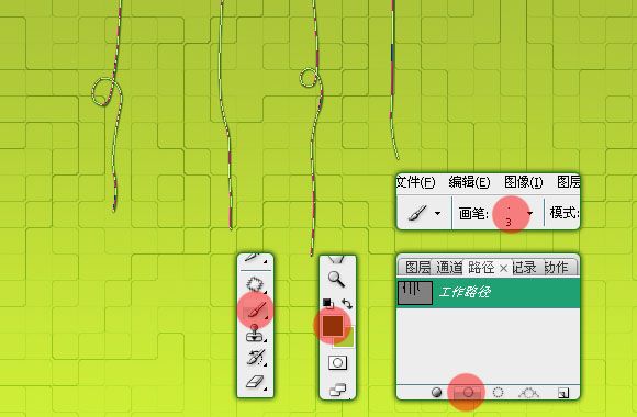 二、選擇畫筆工具,改變前景色為深綠色,改變畫筆的粗細(注意關鍵就是這粗細了,后面的兩次描邊,也要在這里改變粗細的喲),然后在工作路徑面板里點擊進行描邊。