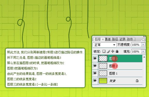 三、照第2步描邊路徑的方法,我們再分別新建層2和層3,并對其進行描邊。