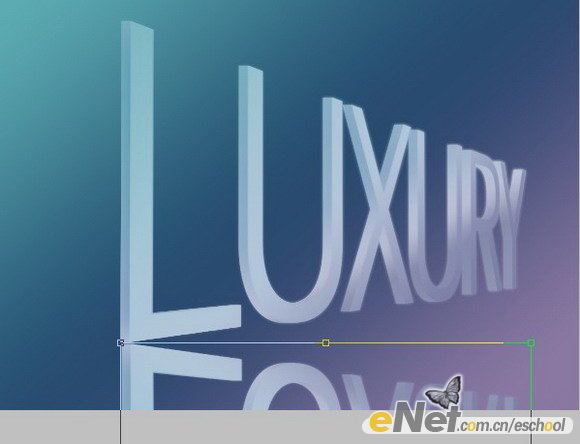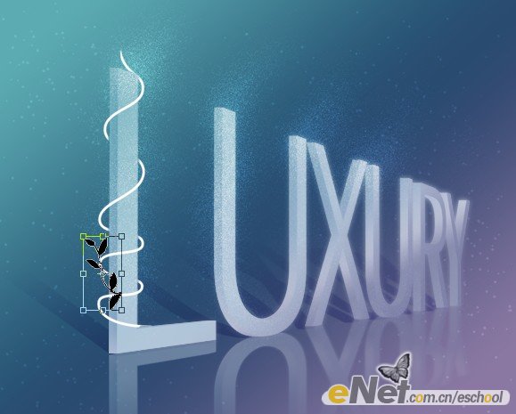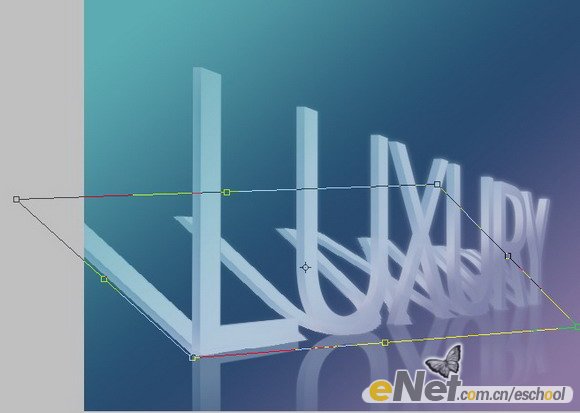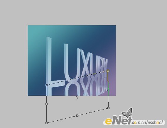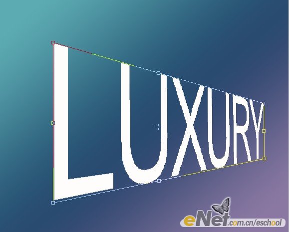 5.在文字圖層“luxury”的圖層名稱上右擊,在彈出的菜單中選擇“柵格化文字”命令,將“luxury”轉換為普通圖層,按ctrl+t鍵調出自由變換控制框,拖動控制框的4個句柄至如圖6所示的狀態以達到透視的效果,按回車確認變換操作。