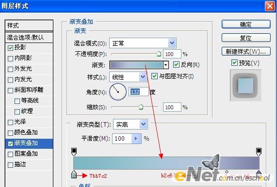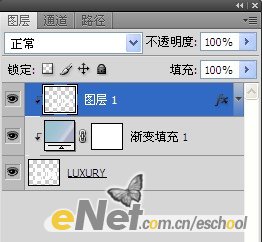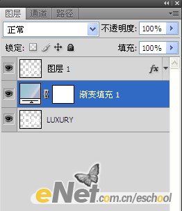 7.首先選擇“luxury”為當前操作狀態,單擊創建新的填充或調整圖層命令按鈕,在彈出的菜單中選擇“漸變”命令,設置彈出的對話框如圖8所示,單擊確定按鈕退出對話框,同時得到圖層“漸變填充1”,按ctrl+alt+g鍵執行“創建剪貼蒙版”操作,得到如圖9所示效果。