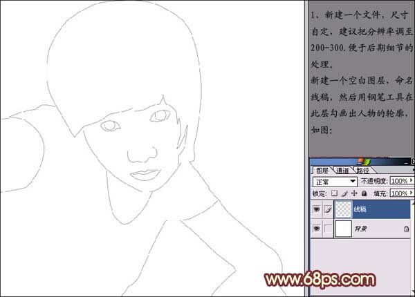 1、新建一個文件,尺寸自定,建議把分辨率調至200-300像素,便于后期細節的處理。新建一個空白圖層,命名線稿,然后用鋼筆工具在此層畫出人物的輪廓如下圖。