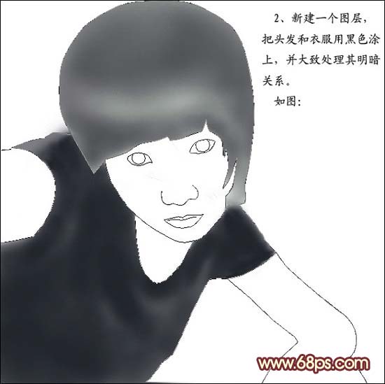 2、新建一個圖層把頭發和衣服用黑色涂上,并大致處理其明暗關系。
