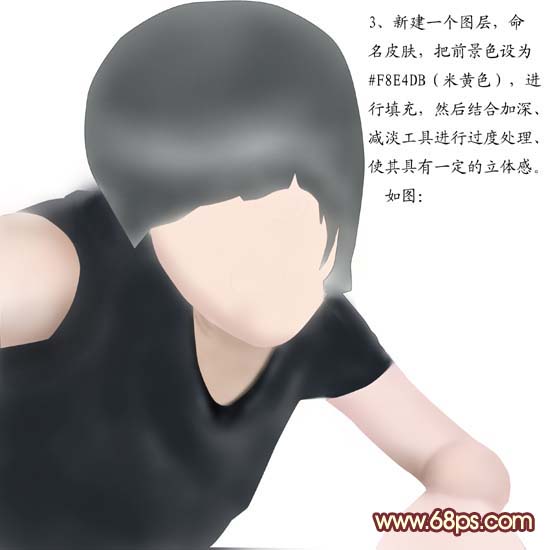 3、新建一個圖層,命名為皮膚,把前景色設為米黃色:#f8e4db,進行填充,然后結合加深/減淡工具進行過度處理,使其具有一定的立體感效果如下圖。