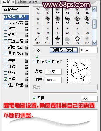 14、復制眉毛圖層,取名為左眼,并將這個圖層放置在眉毛圖層的上面, 按ctrl+t鍵,將眉毛旋轉到合適的角度。在左眼圖層上面再新建一個圖層,取名為睫毛。選擇筆刷工具,在畫筆面板里選擇沙丘草類型的筆刷,直徑設置為13個象素大小。筆刷的角度在畫睫毛的時候要根據自己的需要不斷的調整。畫好睫毛之后,將睫毛層復制一層,然后按ctrl+e合并。
