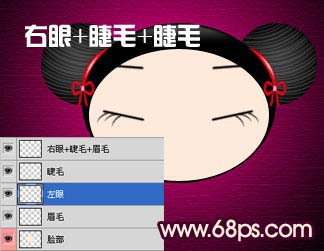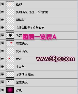 在頭部圖層下方新建一個圖層,取名右邊頭發。隱藏臉部/頭頂高光/蝴蝶結/頭部/背景圖層,然后按ctrl+shift+alt+e鍵蓋印圖層。