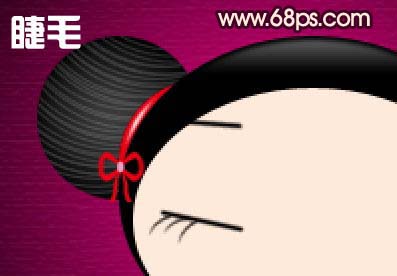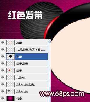 在頭發絲圖層的上方新建一個圖層,取名為發帶。用橢圓選框工具畫一個小一點的圓,填充紅色。并移動到合適的位置上。在發帶圖層上面新建一個名為發帶高光的圖層。選擇2個象素大小的筆刷,在發帶上輕輕的刷一下,加點高光。