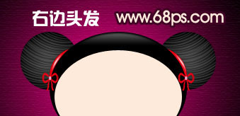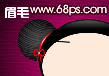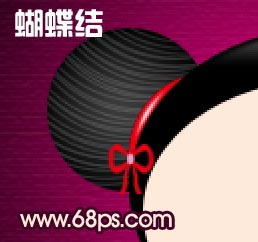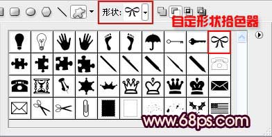 在頭部圖層的上方新建一個圖層,取名為蝴蝶結。在工具條中選擇自定形狀工具,在它的屬性面板打開自定形狀拾色器。找到蝴蝶結的形狀,在畫布上拖拉出合適的大小。按ctrl+enter鍵,將路徑轉換為選區,填充自己喜歡的顏色。最后使用直徑為3個象素大小的筆刷在蝴蝶結的中間點一下。