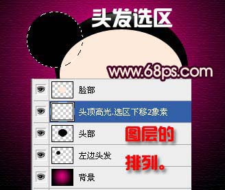 在頭部圖層和背景層的中間新建一個圖層,取名為左邊頭發。選擇橢圓選框工具。畫一個圓并且填充黑色。