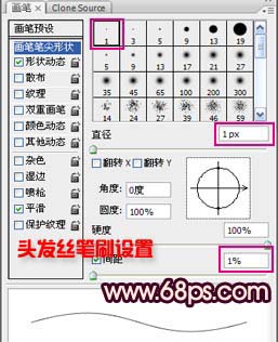 在左邊頭發高光的圖層上方新建一個圖層,取名為頭發絲。在工具條中選擇筆刷工具,設置筆刷的直徑為1個象素。在筆刷面板里將比刷間距設置為1%。
