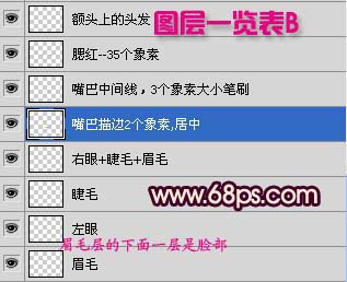 在臉部圖層的上方新建一個圖層,取名為眉毛。設置前景色黑色。選擇直徑為3個象素大小的筆刷,按住shift的同時用畫筆在畫布上畫一條直線,然后按ctrl+t鍵,將眉毛旋轉到合適的角度。