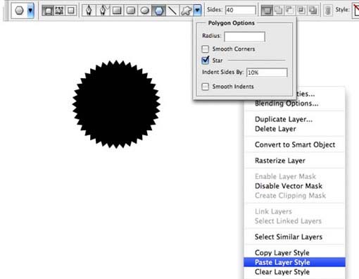 7、 選擇“多邊形工具”(u),參照下圖修改設置,創建一個星形徽章。像步驟3一樣復制該圖層并且調整大小。