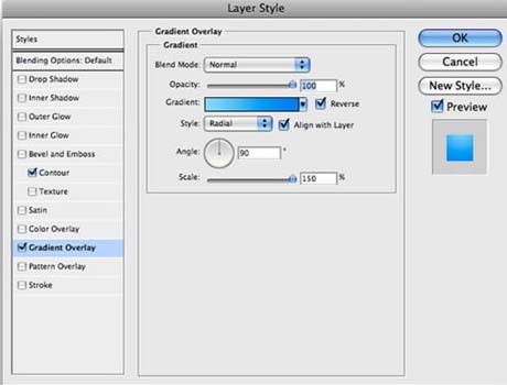 2、雙擊圓形圖層打開圖層樣式窗口,選擇“漸變疊加”,使用藍色和淺藍色做漸變色,在“樣式”下拉框中選擇“徑向”。最后參照下圖為漸變疊加設置“角度”并添加“斜面和浮雕效果”。