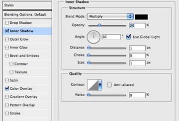 5、選擇“橫排文字工具”(t)創建一個文字圖層,使文字圖層在最頂層。選中文字圖層,打開圖層樣式窗口。選擇“顏色疊加”將文字顏色設置成白色,然后選擇“內陰影”,參照下圖進行設置。