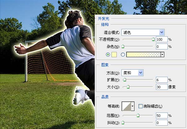 步驟 4、添加外發(fā)光效果,圖層 >> 圖層樣式 >> 外發(fā)光。