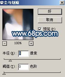 6、新建一個圖層,蓋印圖層,執行:濾鏡 > 雜色 > 蒙塵與劃痕,參數設置如圖14,確定后按ctrl + b調整色彩平衡稍微調青一點,然后把圖層混合模式改為“柔光”,加上圖層蒙版用黑色畫筆把人物部分擦出來,效果如圖15。