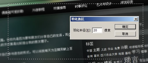 新建一個(gè)圖層:圖層->新建->圖層(快捷鍵ctr+shift+n。或者圖層面板的新建圖標(biāo)。囧,感覺我好啰嗦啊。)。使用矩形選區(qū)工具,新建一個(gè)選區(qū)并羽化,設(shè)置羽化半徑為20像素。
