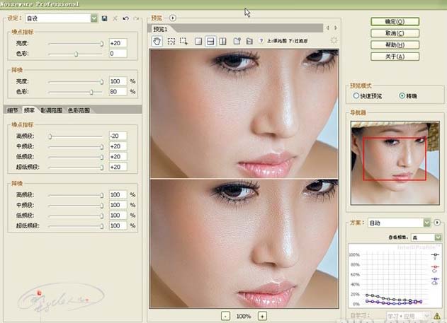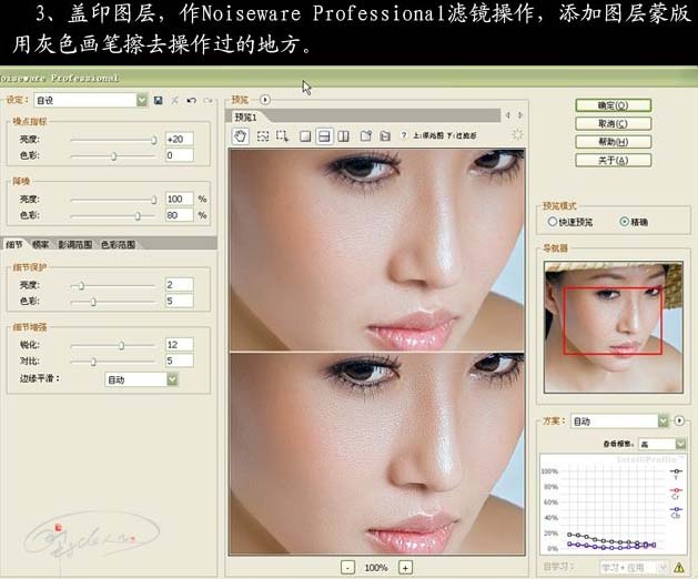3、新建一個圖層,蓋印圖層,做noiseware濾鏡操作,確定后加上圖層蒙版用灰色畫筆擦去操作過度的地方。