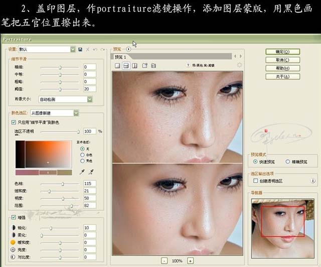 2、新建一個圖層,按ctrl + alt + shift + e蓋印圖層,做portraiture濾鏡操作,大家可以去網上下載,參數設置如下圖,確定后加上圖層蒙版,用黑色畫筆把五官位置擦出來。